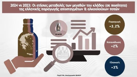 Το 2024 ο κλάδος των ελληνικών αλκοολούχων ποτών επανήλθε σε ανοδική πορεία, μετά τη πτώση του 2023. Η συνολική παραγωγή έφτασε τα 21,4 εκατομμύρια λίτρα καθαρής αλκοόλης, καταγράφοντας αύξηση +3,2% (+0,7 εκ. λίτρα αλκοόλης) σε σχέση με το 2023 και συνολική άνοδο άνω του +20% στη διάρκεια της τελευταίας 10ετίας. Η εξαγωγική δραστηριότητα του κλάδου σημείωσε αύξηση, σε όρους όγκου κατά +3% (+0,4 εκ λίτρα αλκοόλης) και η κατανάλωση των εγχωρίως παραγομένων ποτών αυξήθηκε κατά +2%. (+0,1 εκ λ. αλκοόλης).